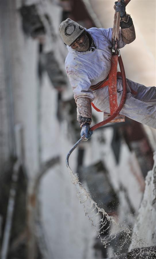 11月1日,施工人员给布达拉宫墙体喷洒涂料。新华社记者 晋美多吉 摄