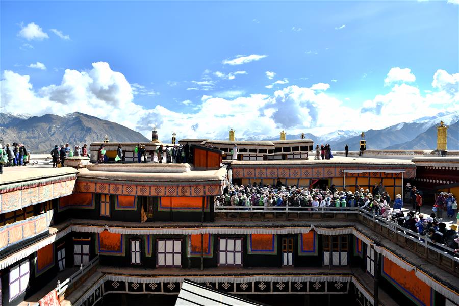 11月1日,施工人员和义工在布达拉宫排队运送涂料。新华社记者 李鑫 摄