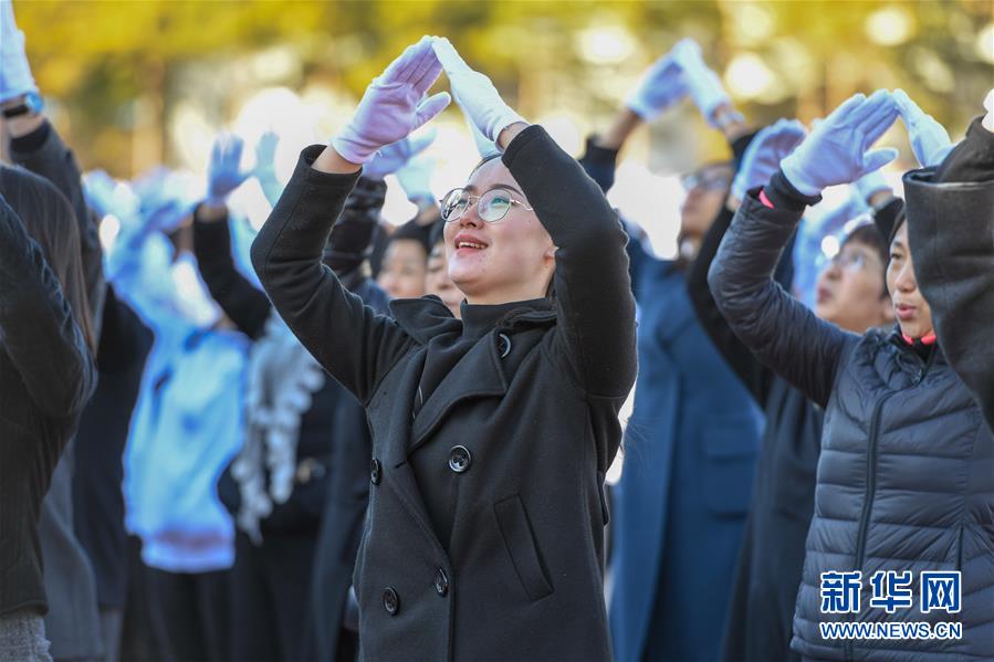 11月1日,长春大学教师们在操场上进行手语“合唱”活动。新华社记者 张楠 摄