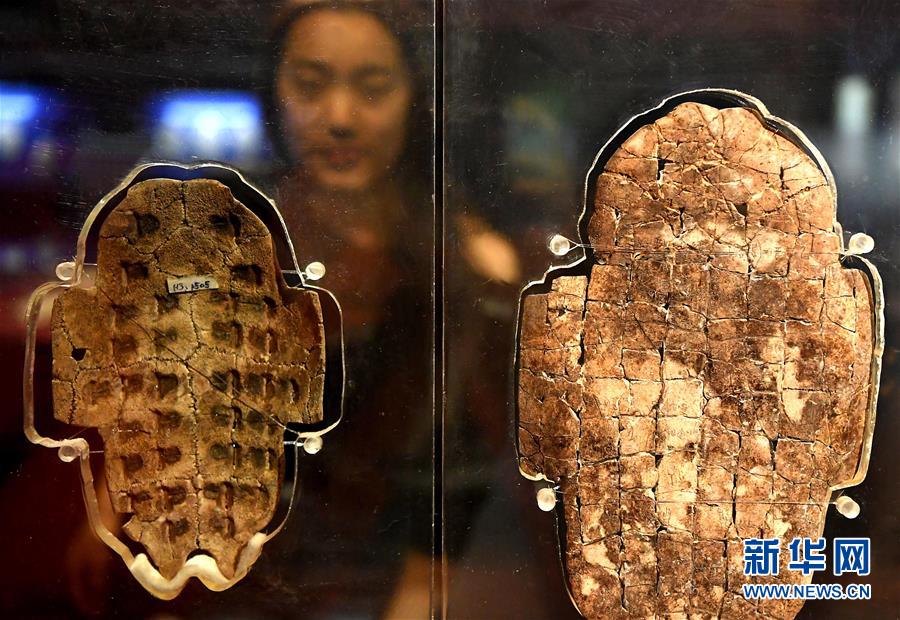 游客在河南安阳殷墟博物馆观看展出的卜甲(2018年10月12日摄)。新华社记者李安摄