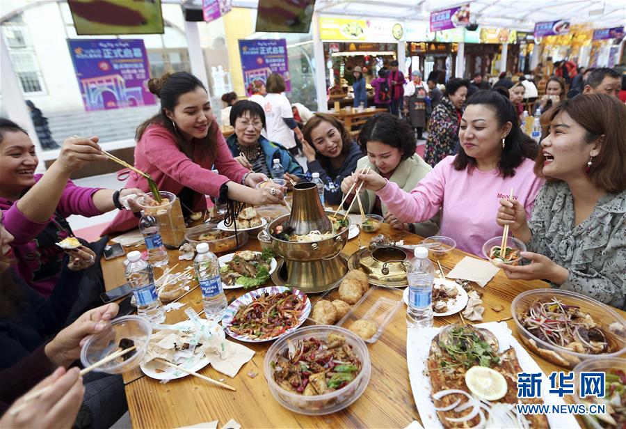 11月2日,游客在大巴扎冰屋美食街品尝免费美食。 位于新疆乌鲁木齐市的大巴扎景区即日起启动冬季运营模式。经过升级改造后的透明全景暖房“冰屋夜市”,在即将到来的冬季,将为天南海北的游客提供具有新疆特色的就餐环境。11月1日至3日,大巴扎景区8大新疆美食文化馆将限时限量向游客提供免费美食。 新华社记者 王菲 摄