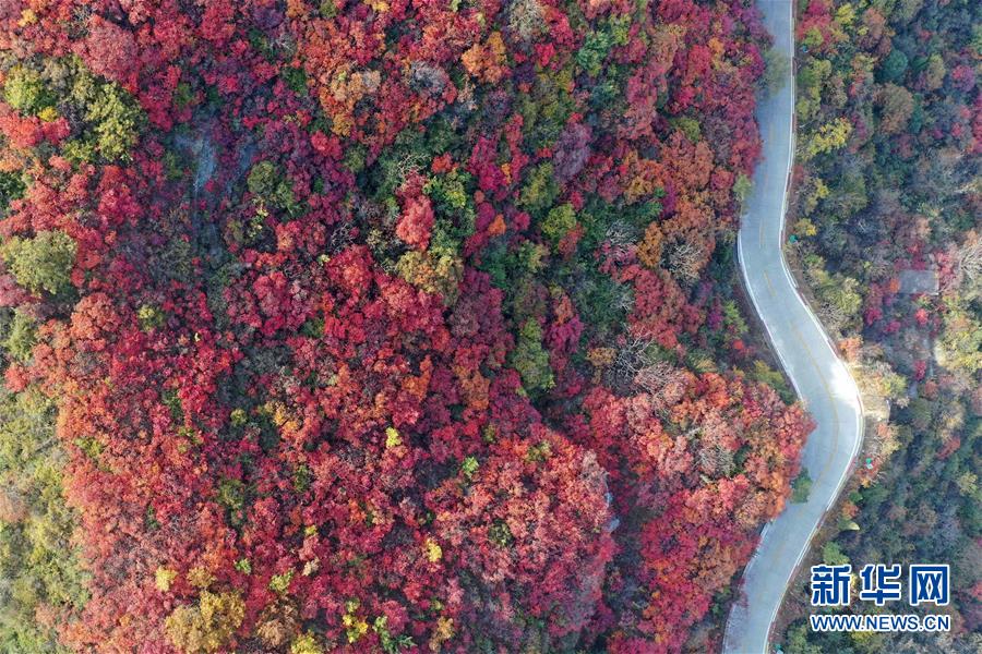 这是11月2日无人机拍摄的河南省巩义市竹林镇长寿山红叶景色。 金秋时节,河南省巩义市竹林镇长寿山的红叶进入观赏期,吸引游人前来休闲观光。 新华社记者 冯大鹏 摄