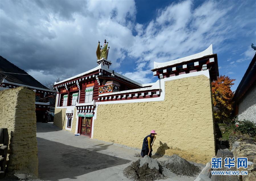 在四川省甘孜藏族自治州道孚县麻孜乡沟尔普旅游新村,村民在修整自家的新房(10月31日摄)。 新华社发(唐文豪摄)