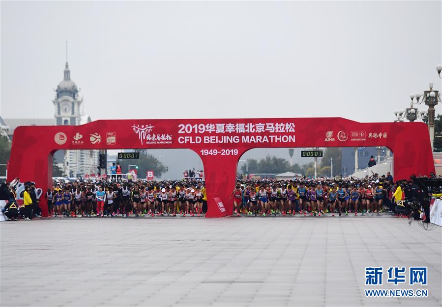 11月3日,参赛选手在比赛中出发。当日,2019北京马拉松赛在北京天安门广场开跑。新华社记者 张晨霖 摄