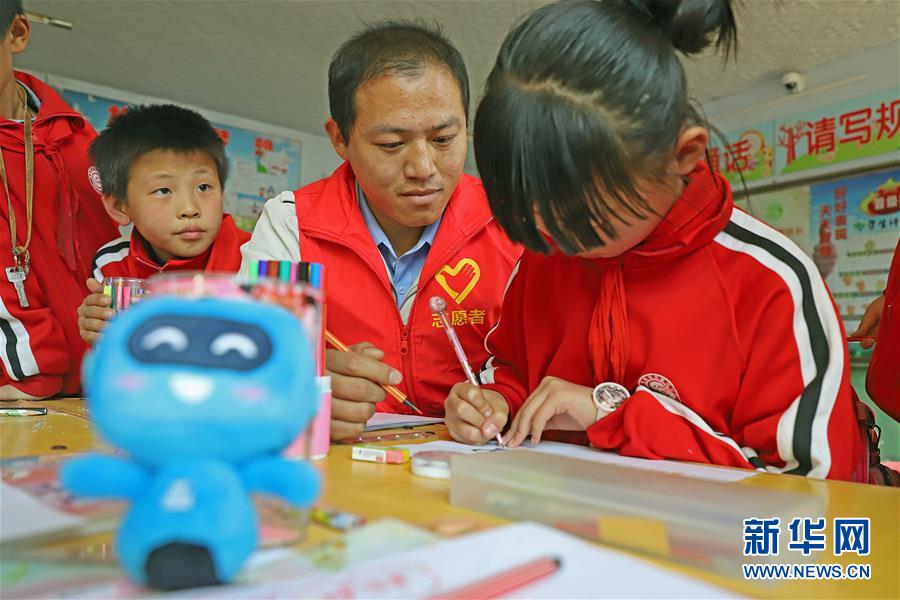 11月4日,支教志愿者在辅导学生画画。 日前,中建三局北京公司铁冀志愿者赴河北涿鹿县武家沟镇寄宿学校开展为期七天的“爱在路上”支教活动。志愿者们与学生同吃住,不仅教授语文、美术等课程,还与孩子们一起游戏,丰富他们的课余生活。 新华社记者 金良快 摄