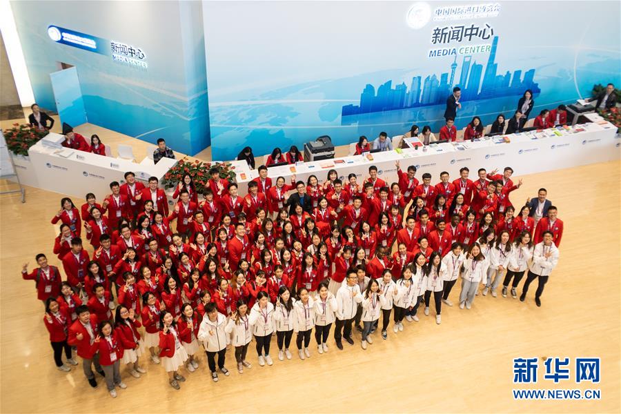 11月4日,第二届进博会部分志愿者在国家会展中心(上海)的新闻中心合影留念。第二届中国国际进口博览会新闻中心于11月4日至10日开放。 新华社记者 张笑宇 摄