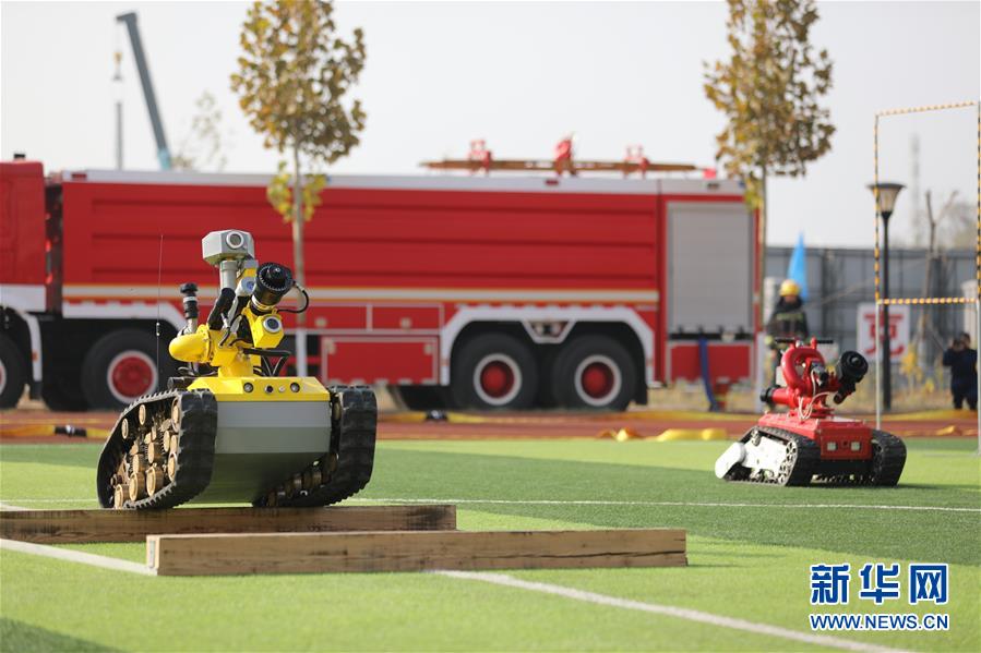 11月5日,在“消防宣传月”启动仪式上,消防机器人在进行消防救援演练。 当日,河北省衡水市消防支队举行“119消防宣传月”启动仪式,演练内容包括火场灭火、障碍救援等。 新华社记者 朱旭东 摄