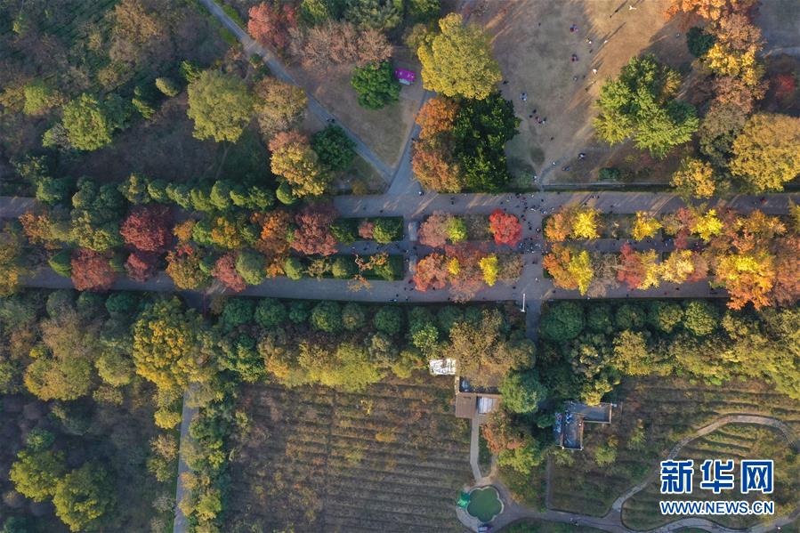 这是11月5日无人机拍摄的南京明孝陵景区石象路。 深秋时节,南京钟山风景区明孝陵石象路色彩斑斓,秋意浓浓,吸引了众多游客前来休闲观光。 新华社记者 李博 摄