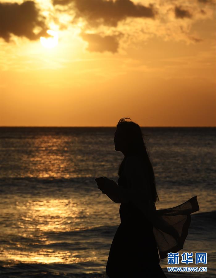 11月5日,一名游客在台湾垦丁白沙湾海滩上欣赏落日美景。 11月5日傍晚,一场降雨过后,台湾垦丁的海岸边披上美丽的落日余晖,风光如诗如画。 新华社记者 陈斌 摄