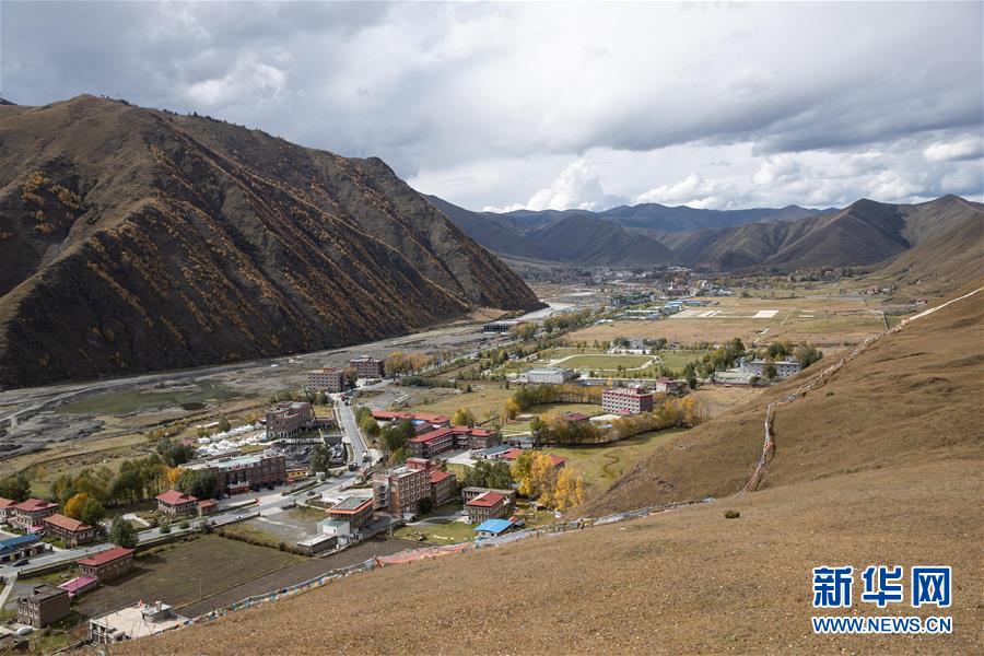 俯瞰318国道新都桥镇段的民居、河流(10月16日摄)。新华社记者 江宏景 摄