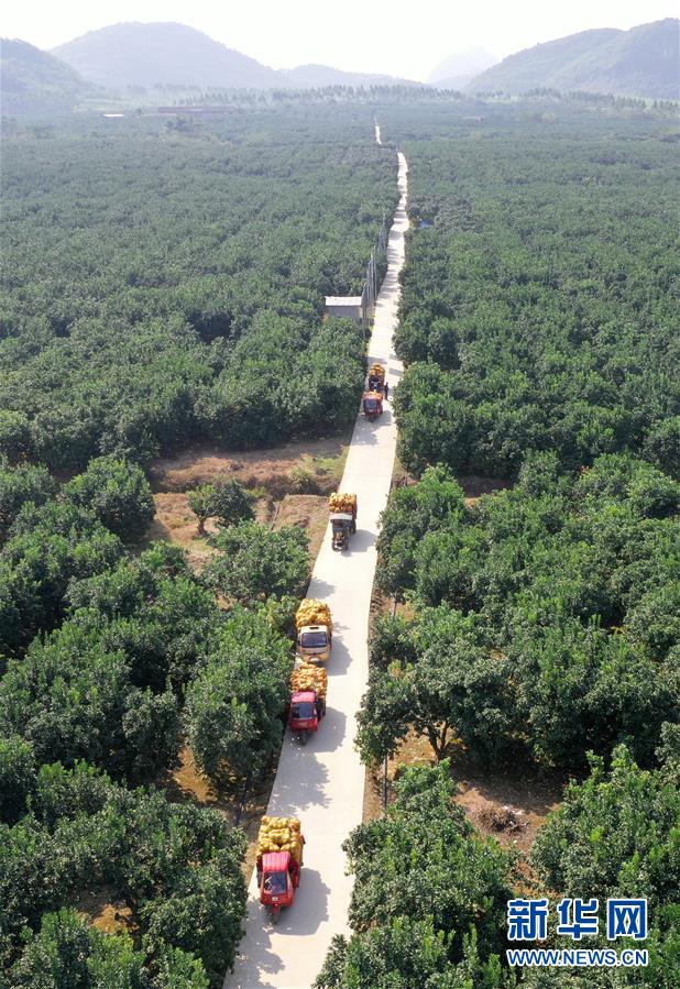 11月5日,装载柚子的车辆在罗城仫佬族自治县金玉柚生态产业扶贫示范区内行驶(无人机拍摄)。 近期,广西罗城仫佬族自治县金玉柚生态产业扶贫示范区的柚子进入采收时节,果农忙碌,柚子飘香。 这片示范区面积达2080亩,已带动附近贫困户、贫困村入股入社,增加贫困户和贫困村集体经济收入。今年示范区金玉柚产量预计将达250万公斤。 新华社记者 陆波岸 摄