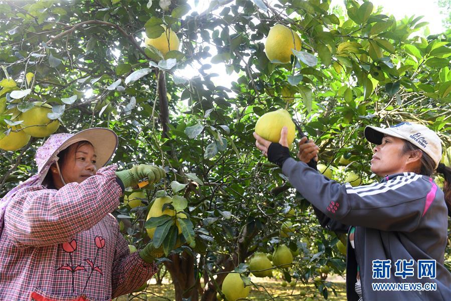 11月5日,村民在广西罗城仫佬族自治县金玉柚生态产业扶贫示范区采收柚子。 近期,广西罗城仫佬族自治县金玉柚生态产业扶贫示范区的柚子进入采收时节,果农忙碌,柚子飘香。 这片示范区面积达2080亩,已带动附近贫困户、贫困村入股入社,增加贫困户和贫困村集体经济收入。今年示范区金玉柚产量预计将达250万公斤。 新华社记者 陆波岸 摄