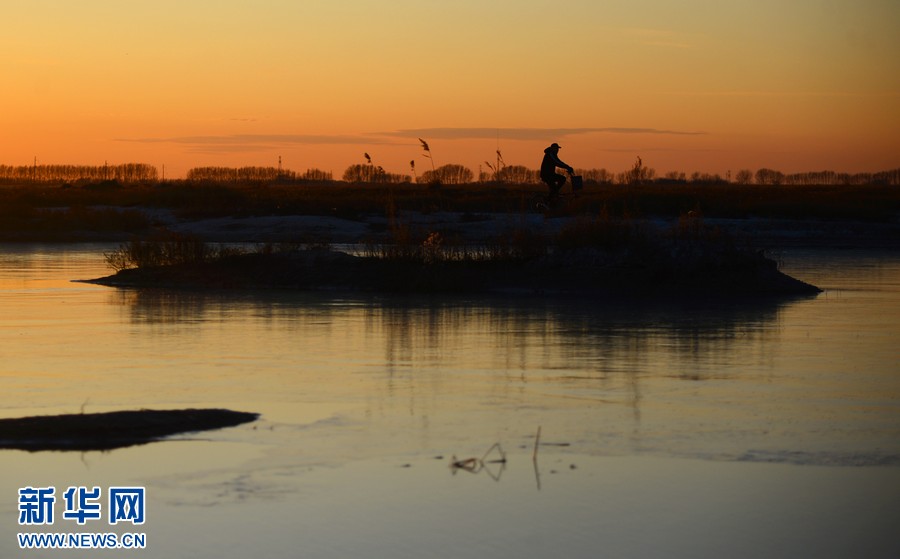 11月5日,一名骑车人从大庆市郊的一个湖泊旁经过。初冬时节,黑龙江多地尚未冰封雪飘,江湖湿地笼罩在暮色暖光之中宛若春华。新华网 杜文杰摄