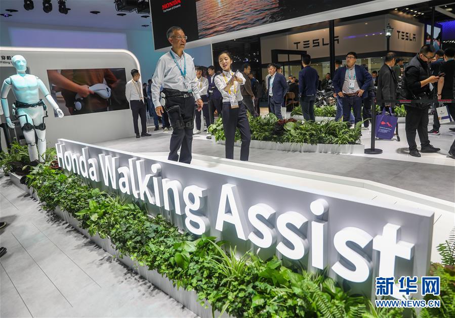 11月6日,参观者在汽车展区本田技研工业株式会社展台体验步行辅助设备。 当日是第二届中国国际进口博览会开幕第二天,上海国家会展中心迎来首个“大客流”。 新华社记者 丁汀 摄