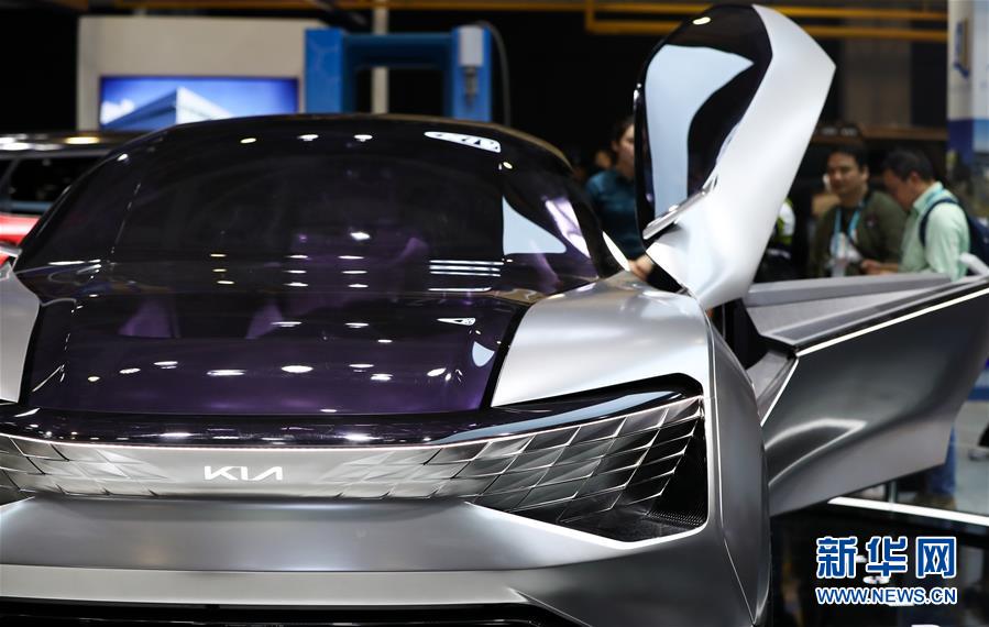 11月6日,人们在汽车展区起亚汽车展台参观一款概念汽车。 当日是第二届中国国际进口博览会开幕第二天,上海国家会展中心迎来首个“大客流”。 新华社记者 丁汀 摄