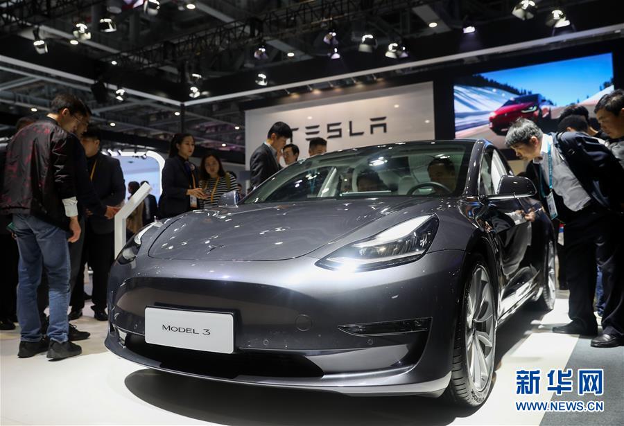 11月6日,在进博会汽车展区,人们在特斯拉展台参观特斯拉MODEL 3汽车。 当日是第二届中国国际进口博览会开幕第二天,上海国家会展中心迎来首个“大客流”。 新华社记者 丁汀 摄