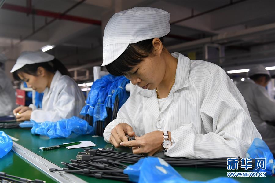 在广西罗城松声电子科技有限公司,吴才忠的爱人庞水娣(右一)在生产作业中(11月6日摄)。这家公司现有工人205人,其中易地扶贫搬迁贫困户71人。 一家人住上县城的新房子,夫妻二人在小区旁上班,小孩在县城上学——现年36岁的仫佬族青年吴才忠一家,过上了易地扶贫搬迁户的新生活。 吴才忠是广西罗城易地扶贫搬迁仫佬家园安置区的搬迁住户,来这里之前,他家住在罗城仫佬族自治县四把镇棉花村下岩屯。那里生产生活条件恶劣,交通不便,石漠化严重,就地发展生产困难。 罗城仫佬族自治县在脱贫攻坚中,建设4个易地扶贫搬迁安置区。2018年6月,吴才忠一家5口告别老家的破旧瓦房,搬到位于县城的罗城易地扶贫搬迁仫佬家园安置区。这个安置区集移民安置住宅、仫佬风情商业街、农村电商中心、农贸市场、学校、医院、民族产业园等于一体,共安置1915户8931人。 不仅住上了100平方米的新房子,吴才忠和爱人庞水娣还被安排在安置区旁边的广西罗城松声电子科技有限公司就近就业,儿子在附近学校就读。“感谢易地扶贫搬迁政策,我们才有了现在的幸福生活。”庞水娣说。 新华社记者陆波岸摄
