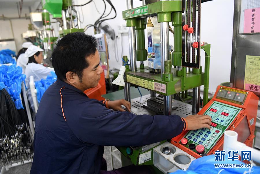 在广西罗城松声电子科技有限公司,吴才忠(右一)在检修一台机械(11月6日摄)。这家公司现有工人205人,其中易地扶贫搬迁贫困户71人。 一家人住上县城的新房子,夫妻二人在小区旁上班,小孩在县城上学——现年36岁的仫佬族青年吴才忠一家,过上了易地扶贫搬迁户的新生活。 吴才忠是广西罗城易地扶贫搬迁仫佬家园安置区的搬迁住户,来这里之前,他家住在罗城仫佬族自治县四把镇棉花村下岩屯。那里生产生活条件恶劣,交通不便,石漠化严重,就地发展生产困难。 罗城仫佬族自治县在脱贫攻坚中,建设4个易地扶贫搬迁安置区。2018年6月,吴才忠一家5口告别老家的破旧瓦房,搬到位于县城的罗城易地扶贫搬迁仫佬家园安置区。这个安置区集移民安置住宅、仫佬风情商业街、农村电商中心、农贸市场、学校、医院、民族产业园等于一体,共安置1915户8931人。 不仅住上了100平方米的新房子,吴才忠和爱人庞水娣还被安排在安置区旁边的广西罗城松声电子科技有限公司就近就业,儿子在附近学校就读。“感谢易地扶贫搬迁政策,我们才有了现在的幸福生活。”庞水娣说。 新华社记者陆波岸摄