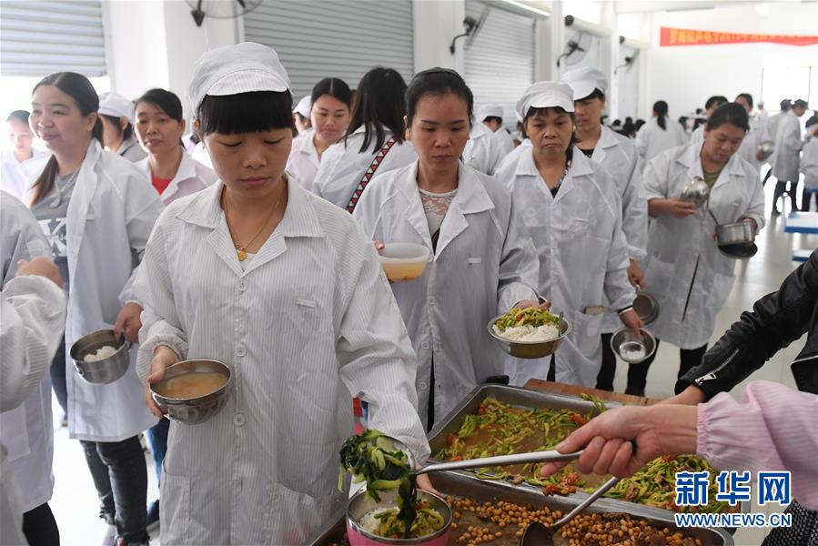 在广西罗城松声电子科技有限公司,吴才忠的爱人庞水娣(前左一)在排队打菜准备吃午饭(11月6日摄)。这家公司现有工人205人,其中易地扶贫搬迁贫困户71人。 一家人住上县城的新房子,夫妻二人在小区旁上班,小孩在县城上学——现年36岁的仫佬族青年吴才忠一家,过上了易地扶贫搬迁户的新生活。 吴才忠是广西罗城易地扶贫搬迁仫佬家园安置区的搬迁住户,来这里之前,他家住在罗城仫佬族自治县四把镇棉花村下岩屯。那里生产生活条件恶劣,交通不便,石漠化严重,就地发展生产困难。 罗城仫佬族自治县在脱贫攻坚中,建设4个易地扶贫搬迁安置区。2018年6月,吴才忠一家5口告别老家的破旧瓦房,搬到位于县城的罗城易地扶贫搬迁仫佬家园安置区。这个安置区集移民安置住宅、仫佬风情商业街、农村电商中心、农贸市场、学校、医院、民族产业园等于一体,共安置1915户8931人。 不仅住上了100平方米的新房子,吴才忠和爱人庞水娣还被安排在安置区旁边的广西罗城松声电子科技有限公司就近就业,儿子在附近学校就读。“感谢易地扶贫搬迁政策,我们才有了现在的幸福生活。”庞水娣说。 新华社记者陆波岸摄