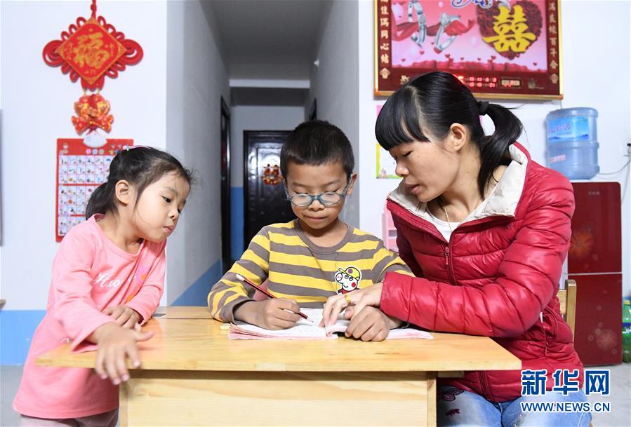 在广西罗城易地扶贫搬迁仫佬家园安置区的家中,吴才忠的爱人庞水娣在指导儿子吴梓豪(中)做作业,刚刚上幼儿园的女儿吴欣怡(左一)在旁边观看(11月6日摄)。 一家人住上县城的新房子,夫妻二人在小区旁上班,小孩在县城上学——现年36岁的仫佬族青年吴才忠一家,过上了易地扶贫搬迁户的新生活。 吴才忠是广西罗城易地扶贫搬迁仫佬家园安置区的搬迁住户,来这里之前,他家住在罗城仫佬族自治县四把镇棉花村下岩屯。那里生产生活条件恶劣,交通不便,石漠化严重,就地发展生产困难。 罗城仫佬族自治县在脱贫攻坚中,建设4个易地扶贫搬迁安置区。2018年6月,吴才忠一家5口告别老家的破旧瓦房,搬到位于县城的罗城易地扶贫搬迁仫佬家园安置区。这个安置区集移民安置住宅、仫佬风情商业街、农村电商中心、农贸市场、学校、医院、民族产业园等于一体,共安置1915户8931人。 不仅住上了100平方米的新房子,吴才忠和爱人庞水娣还被安排在安置区旁边的广西罗城松声电子科技有限公司就近就业,儿子在附近学校就读。“感谢易地扶贫搬迁政策,我们才有了现在的幸福生活。”庞水娣说。 新华社记者陆波岸摄