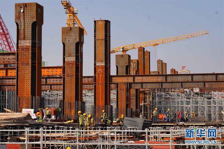 11月7日,工人在雄安站施工。 京雄城际铁路雄安站总建筑面积约47万平方米,地上3层,地下2层。目前,地下主体结构已经完工,全面转入地上主体结构施工。 新华社记者 邢广利 摄