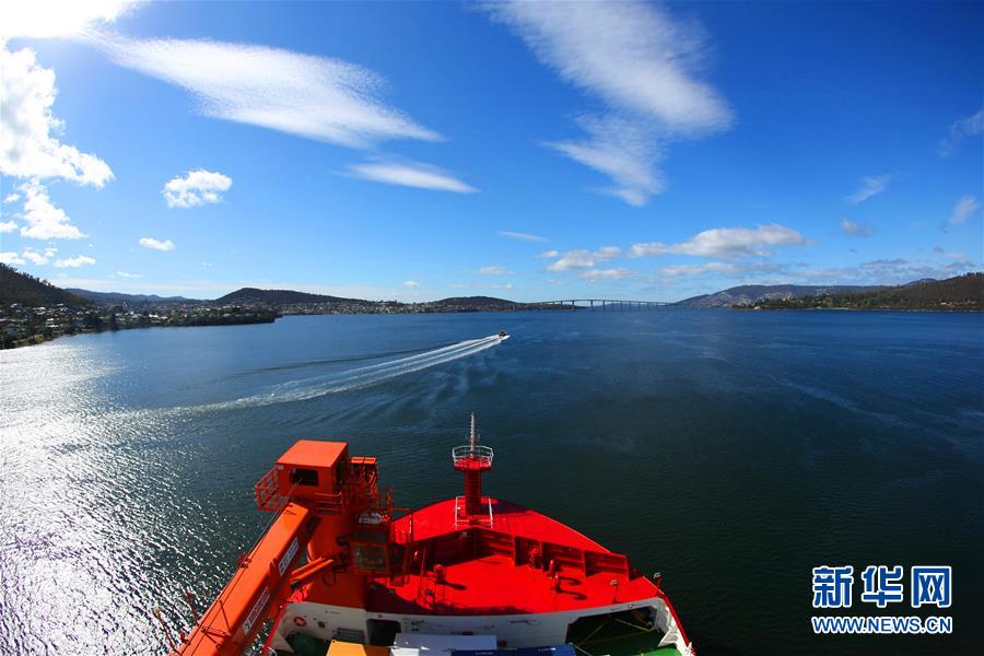 在霍巴特港内航行的“雪龙2”号(11月5日摄)。 11月7日,搭载着中国第36次南极科学考察队队员的“雪龙2”号极地科考破冰船与“雪龙”号进行短暂相聚后,离开澳大利亚霍巴特港,将穿越“咆哮西风带”。 新华社记者 刘诗平 摄