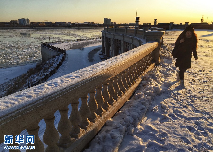 11月8日,在黑河市黑龙江畔,一名女士踏雪而行。新华网 杜文杰 摄
