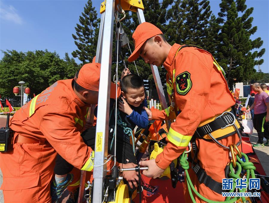 11月9日,在福州市五一广场,消防员帮助一名小朋友体验深井救援装备。 当日是“119消防宣传日”,福建省消防救援总队在福州市五一广场举行全省消防宣传月启动仪式,并在现场展出最新消防装备,通过互动体验等方式向市民介绍消防安全常识和逃生自救实用技能。 新华社记者 宋为伟 摄