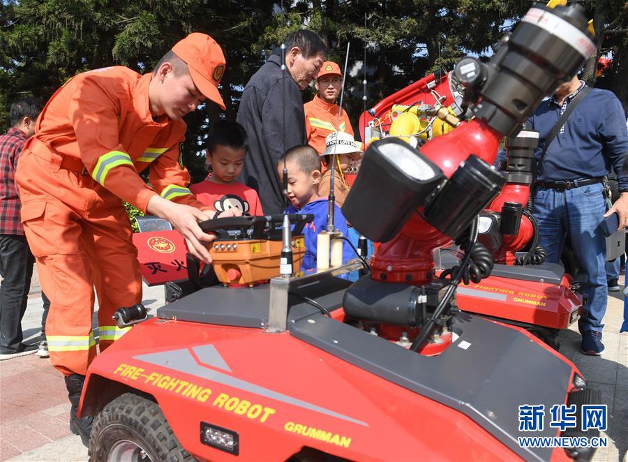 11月9日,在福州市五一广场,消防员向小朋友介绍演示消防机器人操控。 当日是“119消防宣传日”,福建省消防救援总队在福州市五一广场举行全省消防宣传月启动仪式,并在现场展出最新消防装备,通过互动体验等方式向市民介绍消防安全常识和逃生自救实用技能。 新华社记者 宋为伟 摄