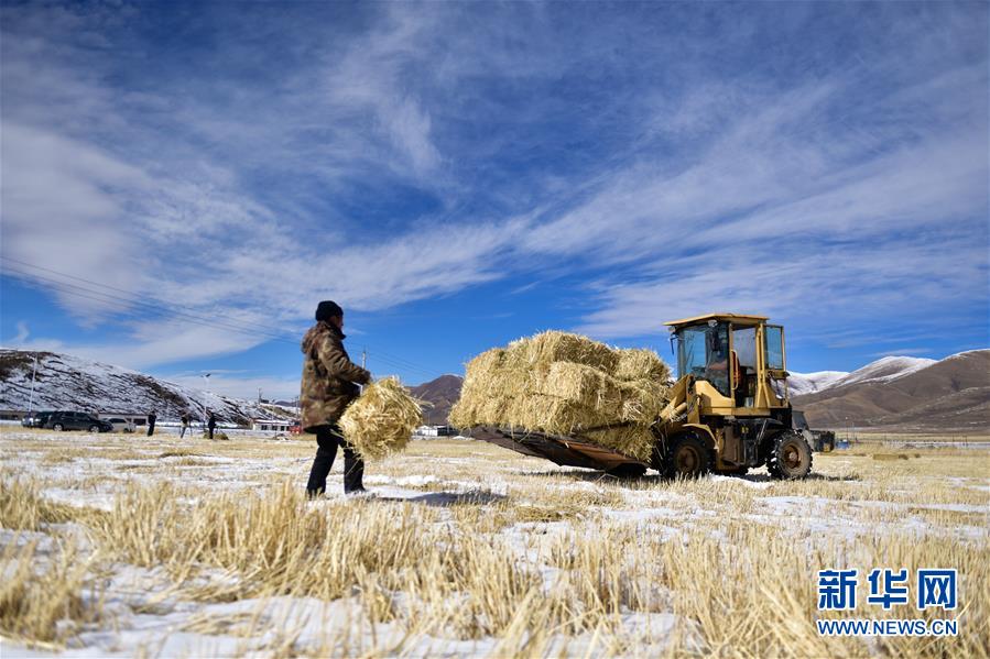 11月8日,青海省果洛藏族自治州玛沁县大武乡牧民新春在搬运草料。 近日,青海南部地区出现大范围降雪降温天气。为应对天气变化给农牧业带来的影响,青海省果洛藏族自治州玛沁县牧民积极储备草料,确保牲畜安全越冬。 新华社记者 张龙 摄