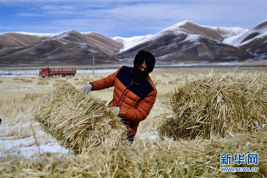11月8日,青海省果洛藏族自治州玛沁县大武乡牧民藏木改在搬运草料。 近日,青海南部地区出现大范围降雪降温天气。为应对天气变化给农牧业带来的影响,青海省果洛藏族自治州玛沁县牧民积极储备草料,确保牲畜安全越冬。 新华社记者 张龙 摄