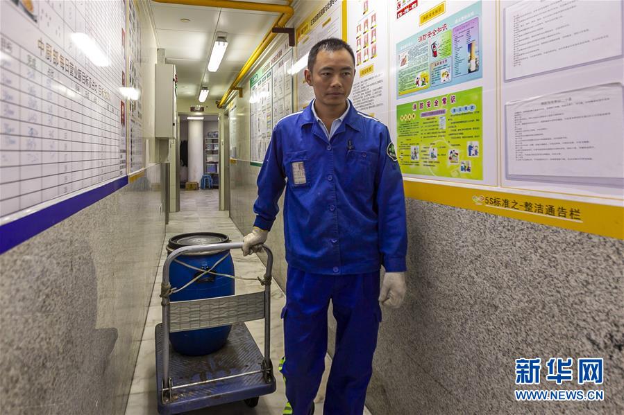 在上海徐汇区唐宫海鲜舫,餐厨废弃油脂收运员曹建林将收好的废油带走(10月18日摄)。新华社发(王翔 摄)