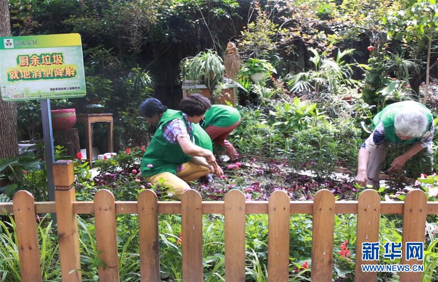 上海虹口区广灵二居民区志愿者在参与“灵碳家园”建设,以宣传垃圾源头减量知识(7月4日摄)。新华社发(吴一航 摄)