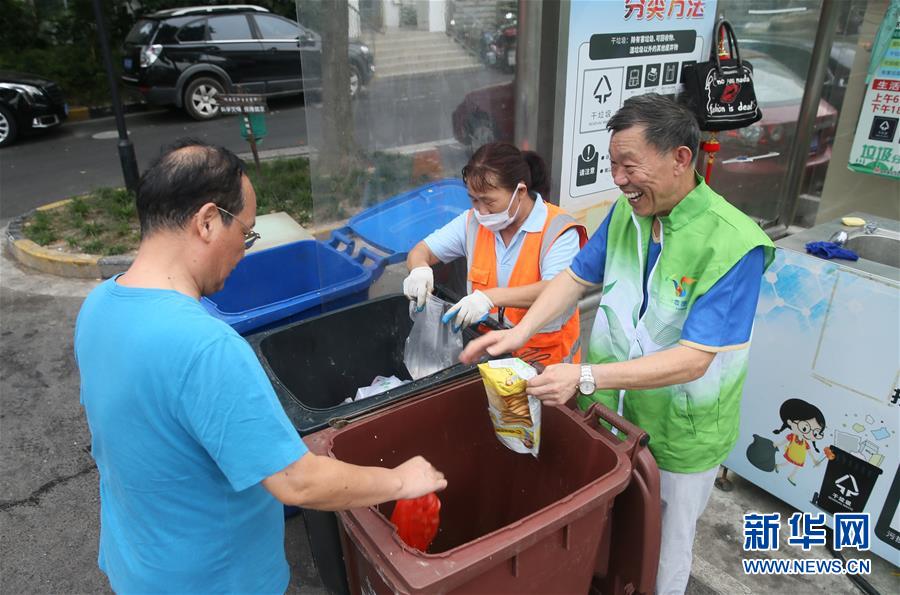 上海闵行区马桥镇夏朵园小区业委会主任陈锡贤(右)在指导小区居民分类投放垃圾(7月25日摄)。新华社发(王翔 摄)