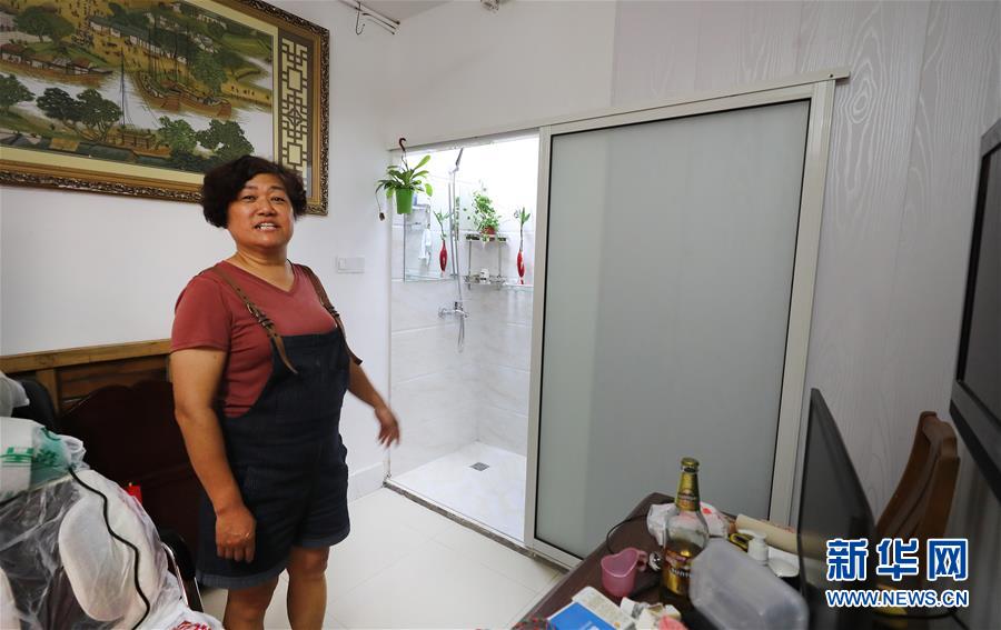 家住静安区新汉兴居民区宝昌路731弄的李才英在介绍自家改造完成的卫生间(7月18日摄)。新华社记者 方喆 摄