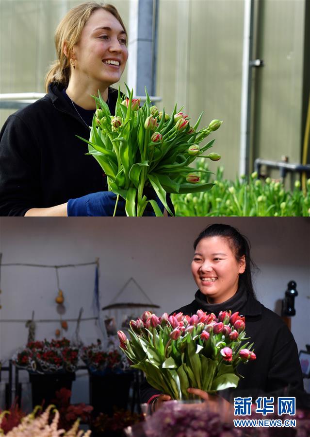 这是一张拼版照片,上图为:11月4日在荷兰特里弗洛尔农场中,花农手捧郁金香鲜花(新华社记者林立平摄);下图为:11月7日在河南郑州小马进口鲜花店,臧晶晶手捧郁金香鲜花(新华社记者李嘉南摄)。新华社发