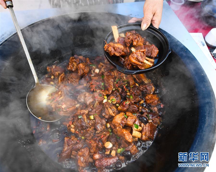 11月9日,五杭集镇的农家乐厨师在活动现场烹饪传统红烧羊肉。 新华社记者 徐昱 摄