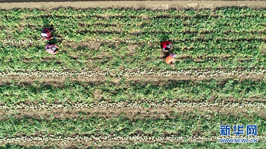 11月9日,河北省唐山市丰润区白官屯镇郭官屯村农民在收获萝卜(无人机拍摄)。新华社记者 牟宇 摄