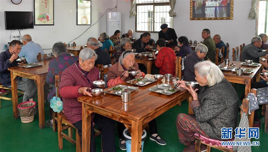 11月9日,在江西省新余市渝水区珠珊镇花田村“颐养之家”,村里的老人在吃午饭。 从2016年开始,江西省新余市在农村建设“颐养之家”,为73周岁以上的老人提供热菜热饭和日间生活照料等服务。老人们只要每人每月缴纳200元费用,就可以一天三餐吃到营养丰富的饭菜。目前,新余市413个行政村都建立了“颐养之家”,“入家”老人超过10000人。 新华社记者 彭昭之 摄