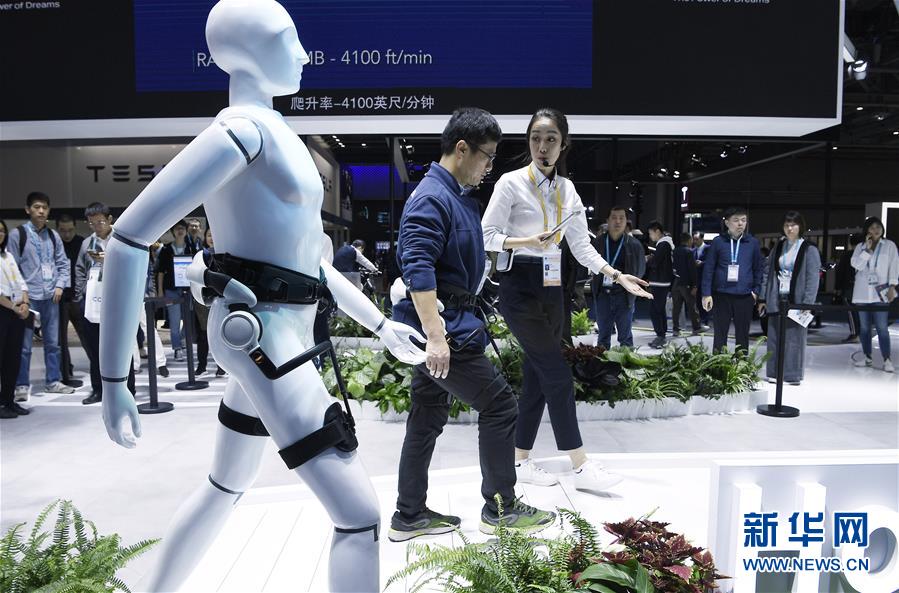 11月10日,在第二届进博会汽车展区,参观者(中)在工作人员的指导下体验本田公司生产的步行辅助设备。 第二届中国国际进口博览会11月5日至10日在上海国家会展中心举行。 新华社记者 王鹏 摄