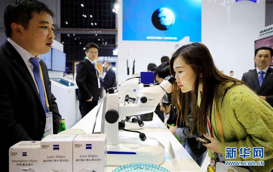 在第二届进博会装备展区德国蔡司公司展台,参观者体验一款数码互动教学系统产品(11月8日摄)。 新华社记者 方喆 摄