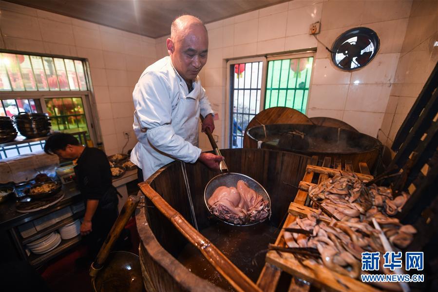 11月10日,仓前街道苕溪村的厨师从大羊锅里捞出烧好的羊肉。 当日,杭州市余杭区仓前街道苕溪村“仓前羊锅节”开幕,上万市民、游客来此乐享“掏羊锅”。 苕溪村是远近闻名的“羊锅村”,当地“掏羊锅”已有100多年历史。羊锅中的羊肉、羊肚、羊肝等一起在高汤中炖煮,人们从锅中掏出什么便大快朵颐,这就是“掏羊锅”。近年来,当地主打“掏羊锅”品牌、加大美丽乡村建设、举办稻田音乐会,吸引越来越多的游客来此体验别样的羊锅农家乐。预计2019年秋冬羊锅季将为当地带来50多万人次的游客和5000多万元的营业额。 新华社记者 徐昱 摄