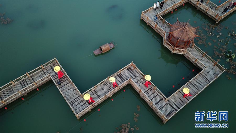 11月10日,村民模特队在侯台子村水上公园走秀(无人机拍摄)。新华社记者 金良快 摄