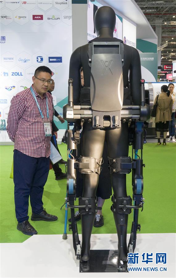11月8日在第二届进博会医疗器械及医药保健展区爱布人工智能科技公司展台拍摄的一款可穿戴外骨骼康复步行机器人。 第二届中国国际进口博览会11月5日至10日在上海国家会展中心举行。 新华社记者 才扬 摄