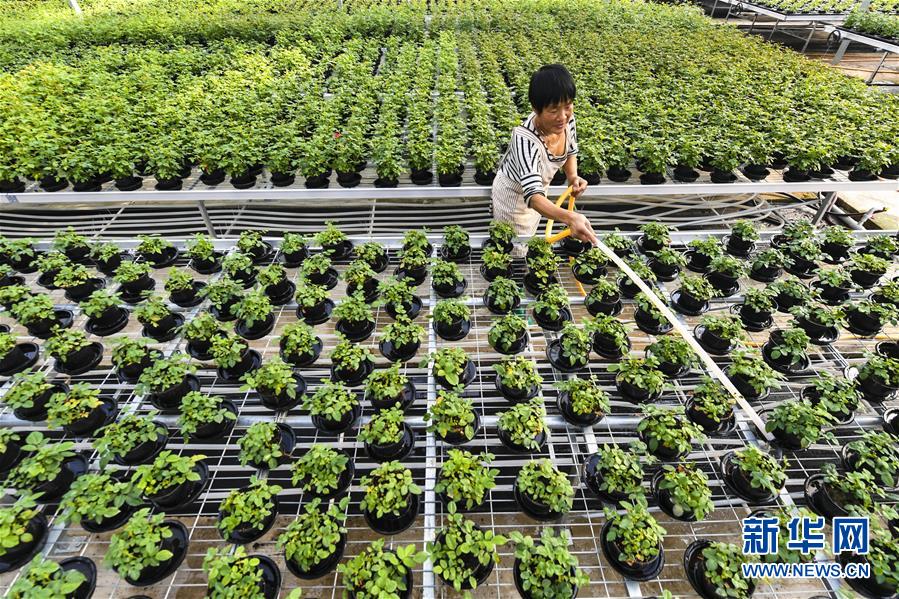 11月11日,霸州市一家农业科技公司的工人为花卉种植基地的花卉浇水。新华社记者 李晓果 摄
