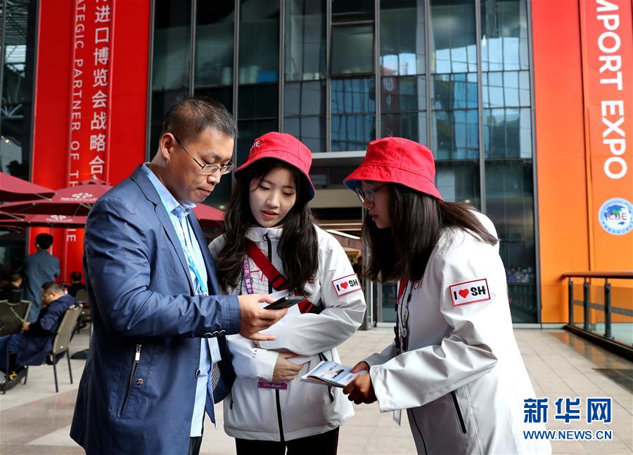 11月7日,进博会志愿者指导观众通过手机APP查找展商信息。 新华社记者 刘颖 摄