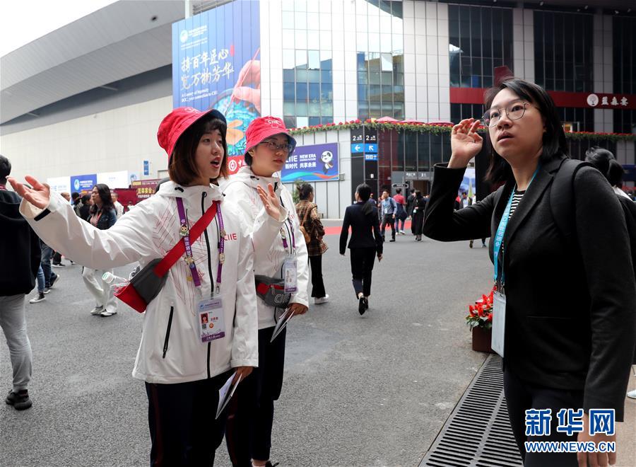 11月7日,进博会志愿者为观众指路。 新华社记者 刘颖 摄