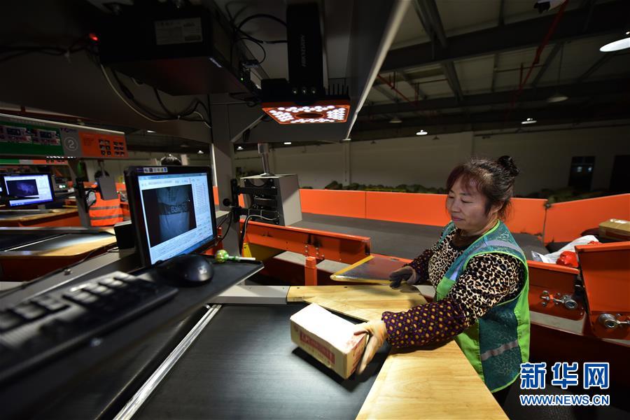 在贵州省龙里县一快递公司的自动化分拣车间,拣配员在流水线上工作(2018年11月13日摄)。新华社发(龙毅 摄)