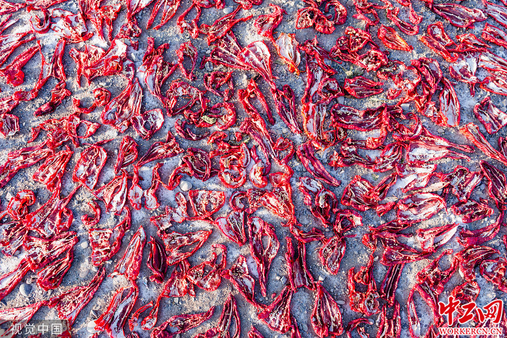 2019年11月10日,新疆阿克苏,晾晒场内火红的辣椒。进入初冬,天气渐凉,车县戈壁滩上的各族群众忙着将晾晒的辣椒进行翻晒,或将晾晒好的辣椒进行装车。无人机俯瞰一片又一片火红的辣椒,好似为大地铺上红色地毯。图片作者:袁欢欢/视觉中国