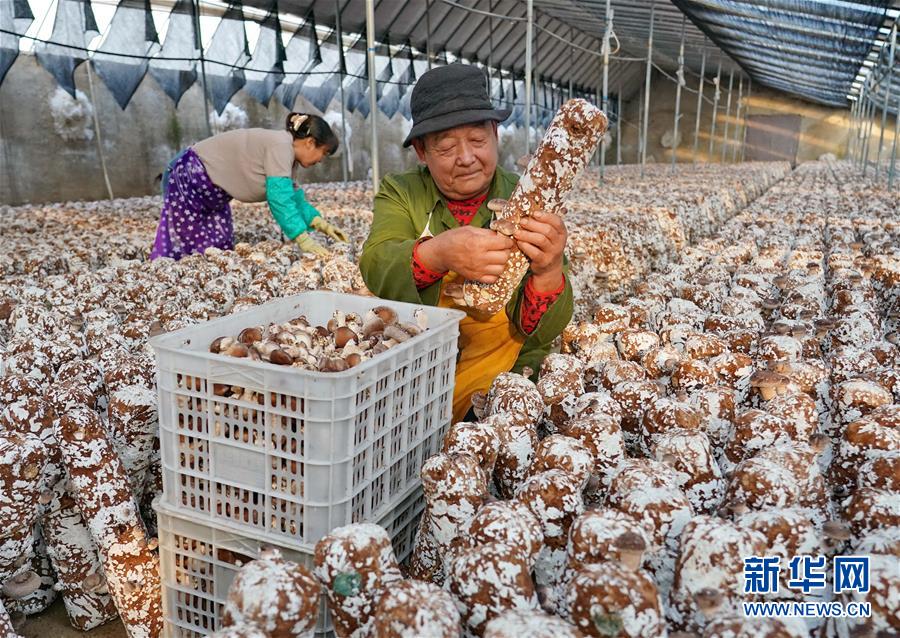 11月12日,遵化市平安城镇一家香菇培育合作社的社员在大棚内采摘香菇。 近年来,河北省遵化市引导农民规模化培育香菇等食用菌,助力乡村振兴。据介绍,目前该市年产鲜菇30万吨,年产值可达25亿元。 新华社记者 杨世尧 摄